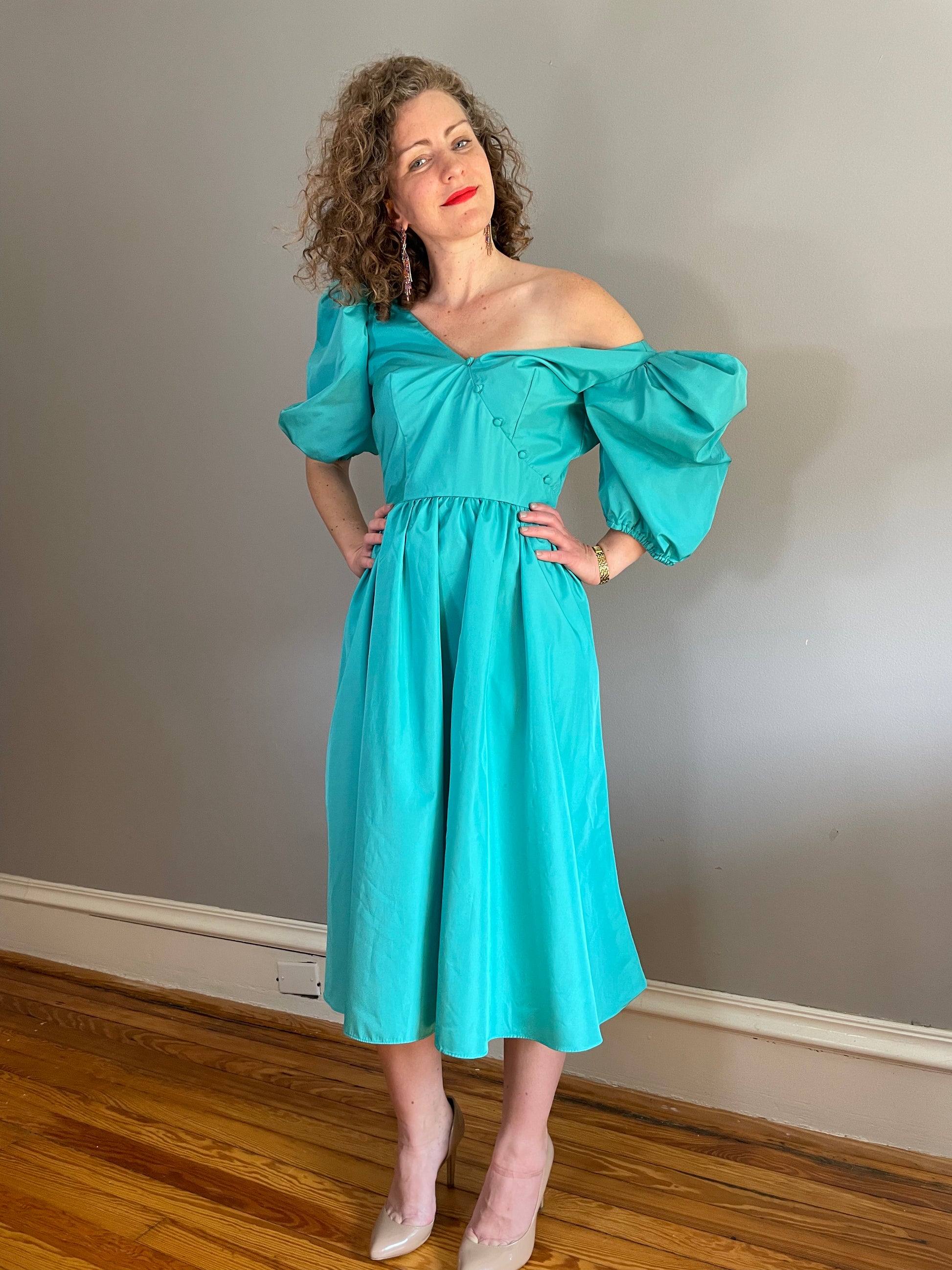 A teal party dress that is lightweight but has that 80s drama we love so much. This piece has been priced as is