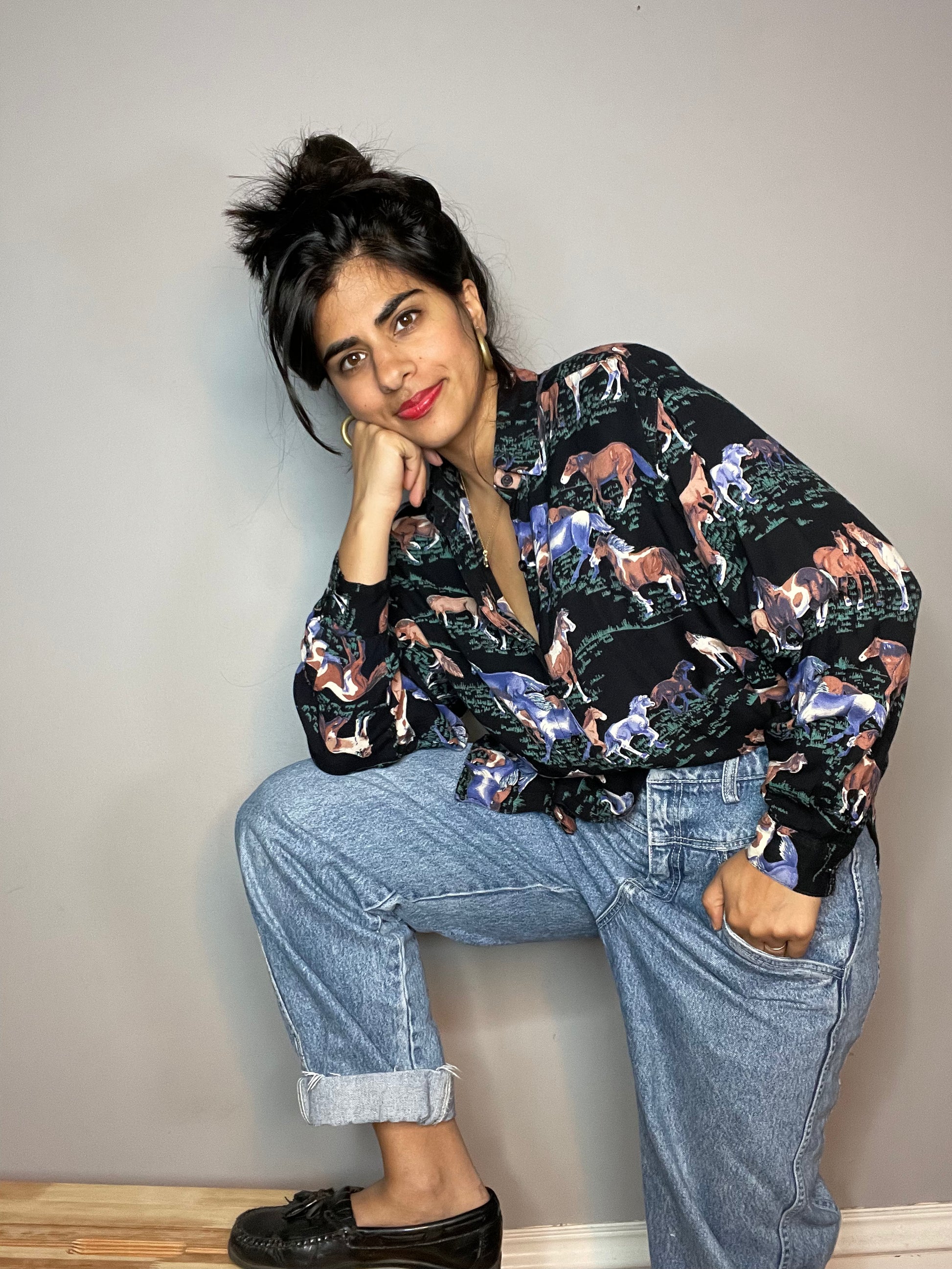 ITEM DESCRIPTION: Black Equestrian Print Blouse