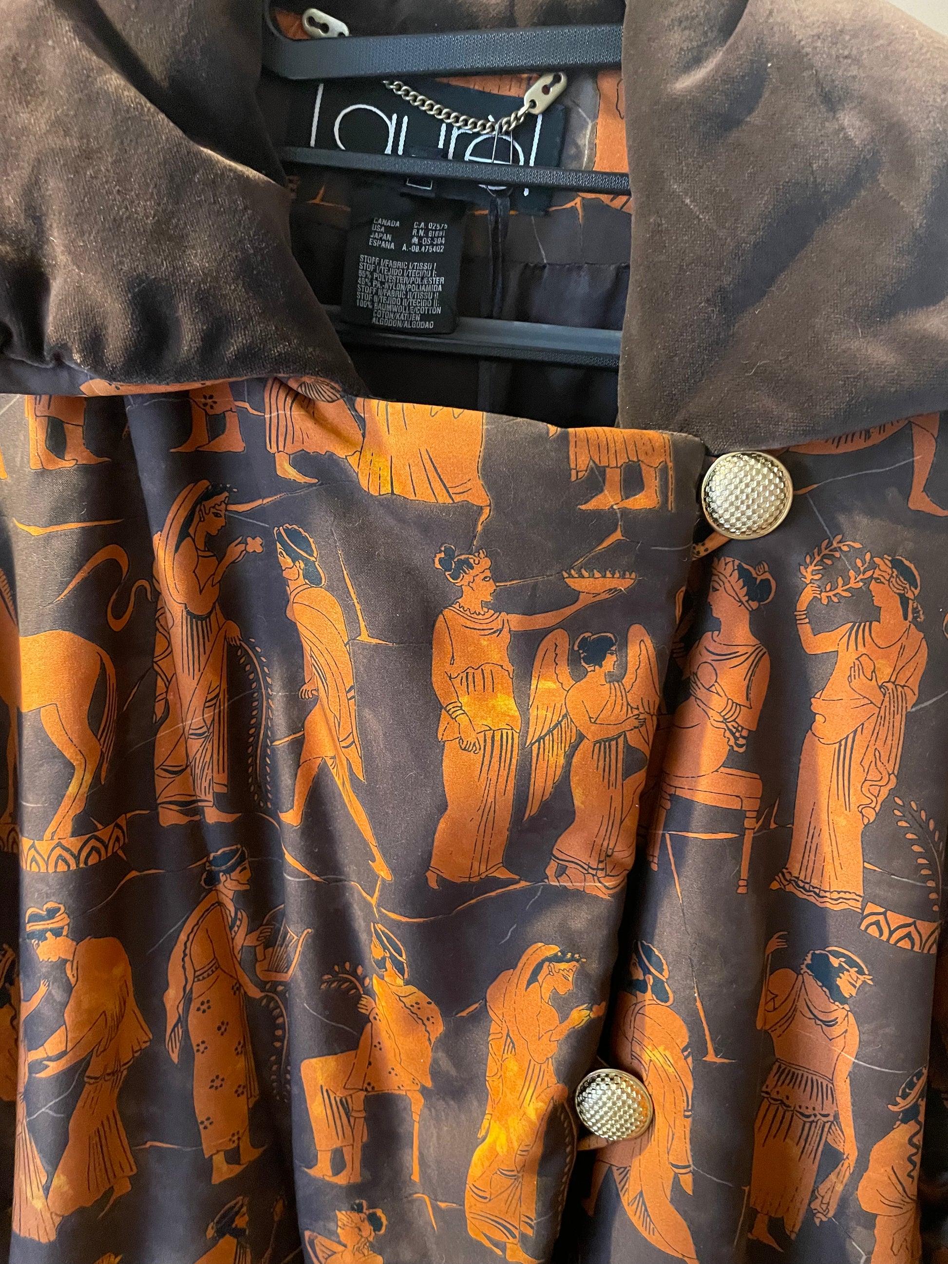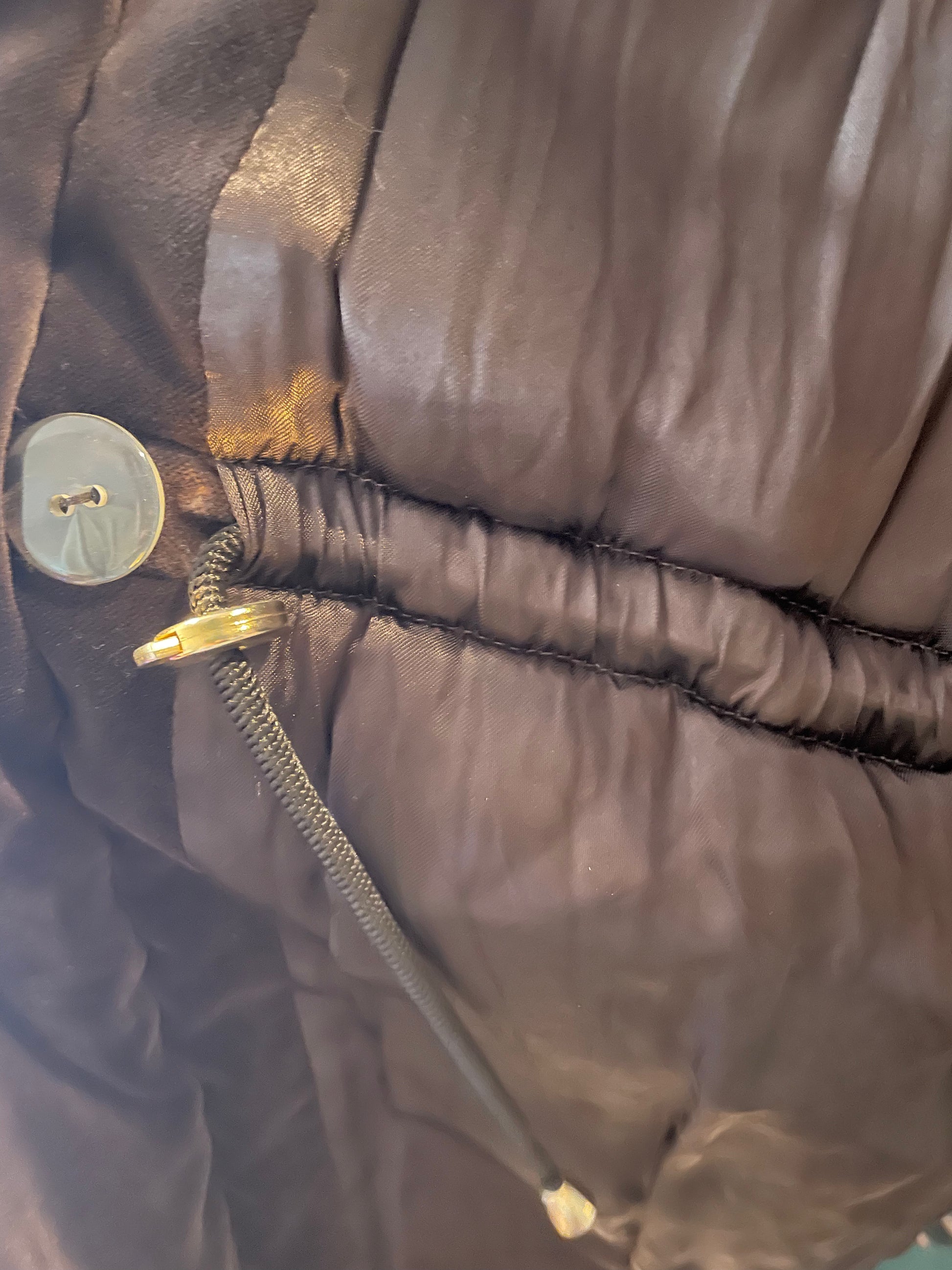 ADDITIONAL DETAILS: The coat has an inner-draw string for adjusting the waist of the jacket; the coat closes with gold-toned buttons; the cuffs and collar have a velvety fabric