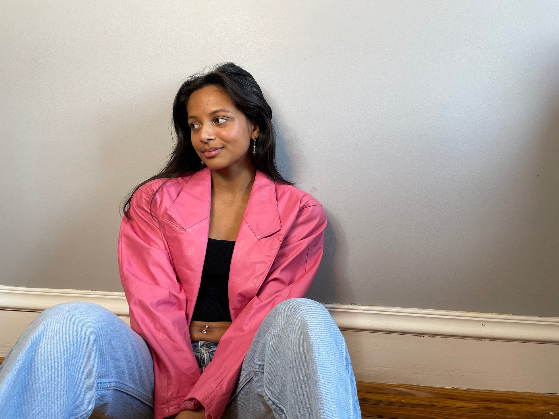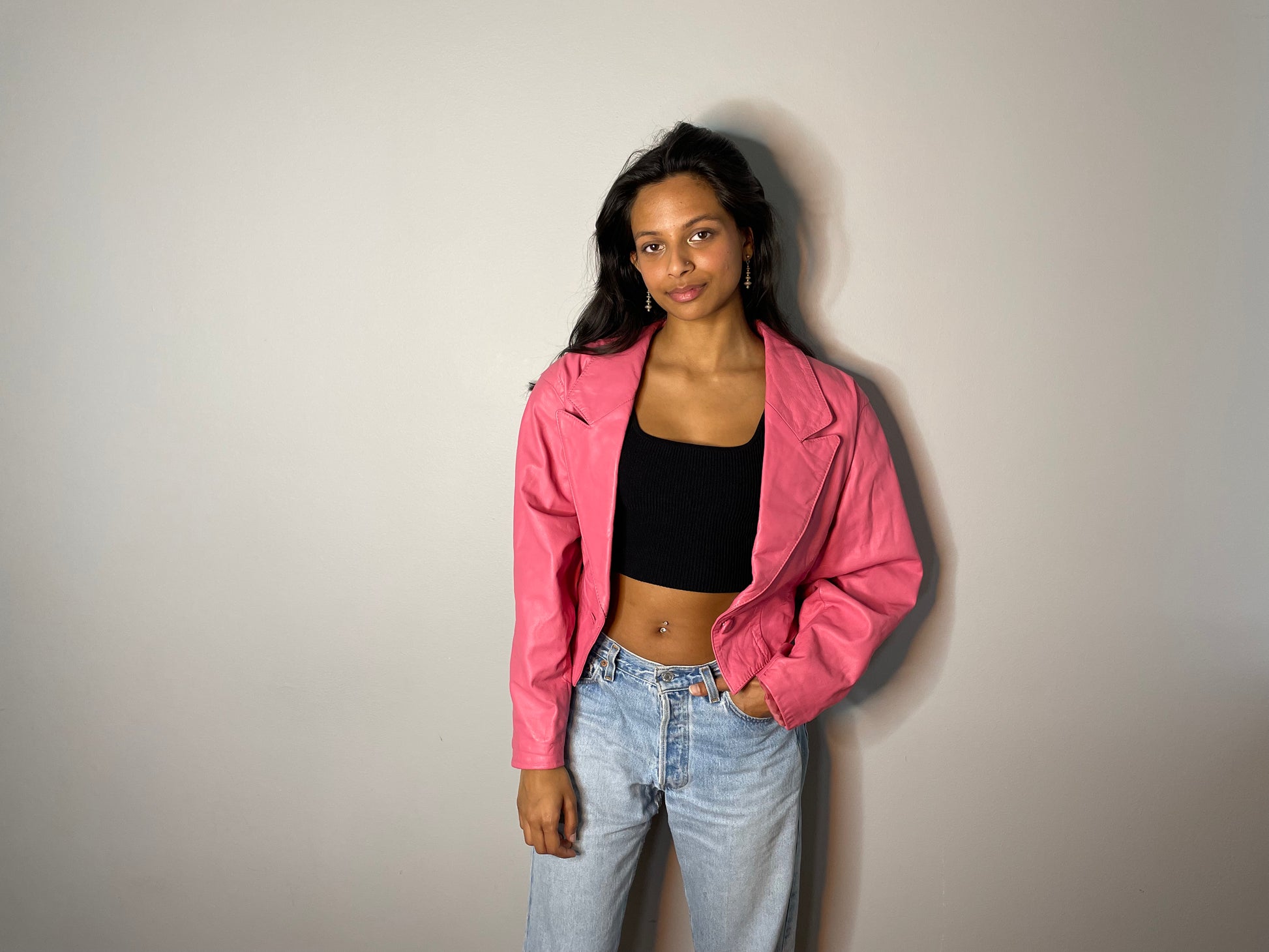 A stunning cropped pink leather jacket with exaggerated shoulders (includes shoulder pad) and a perfect cinch almost corset style bodice.