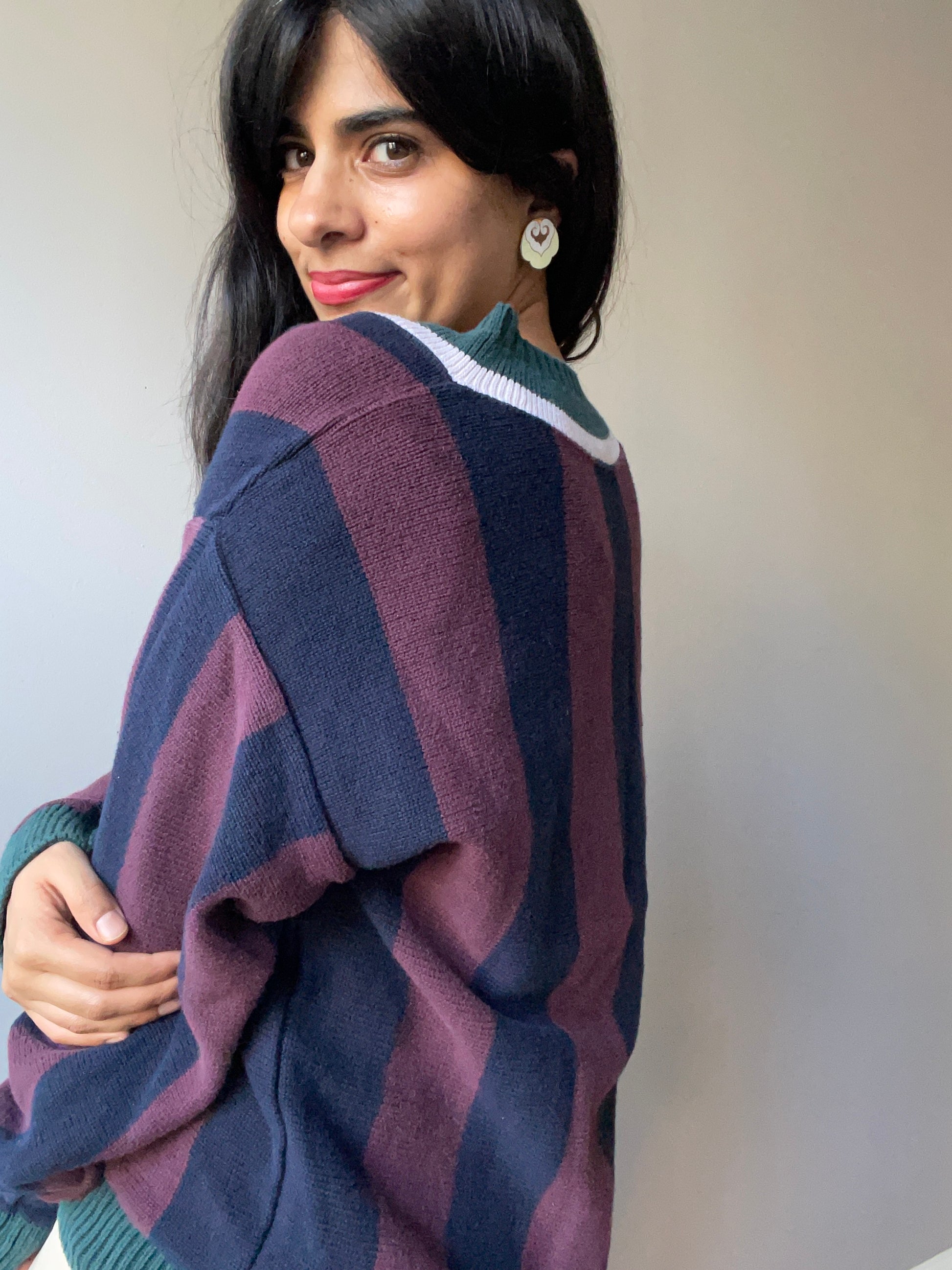 Cozy varsity sweater with navy and burgundy stripes and a green collar