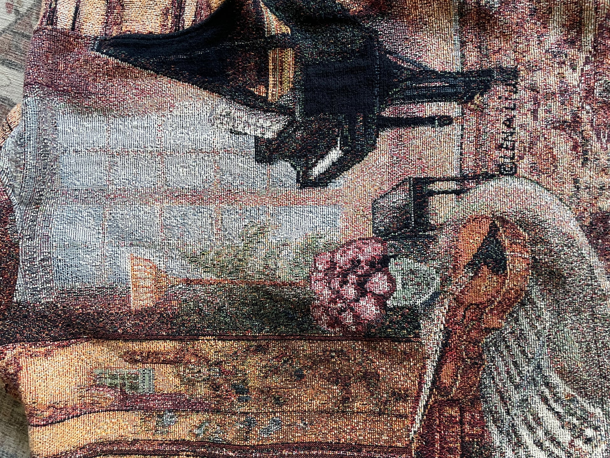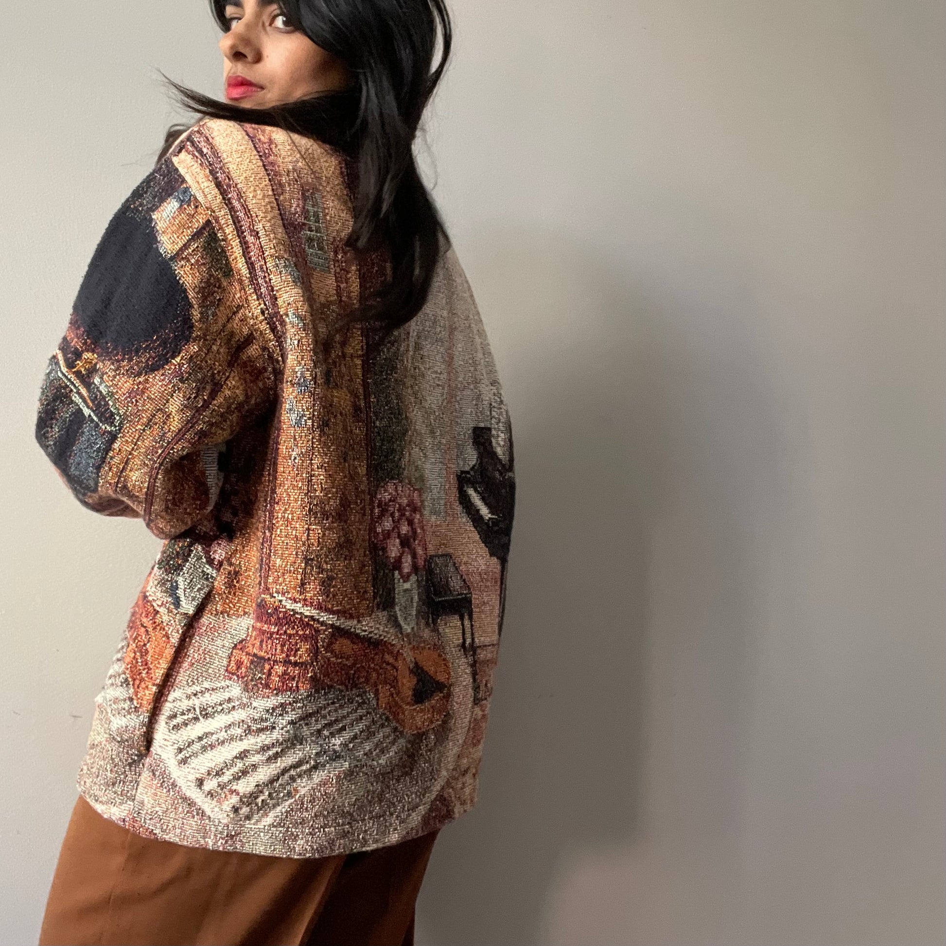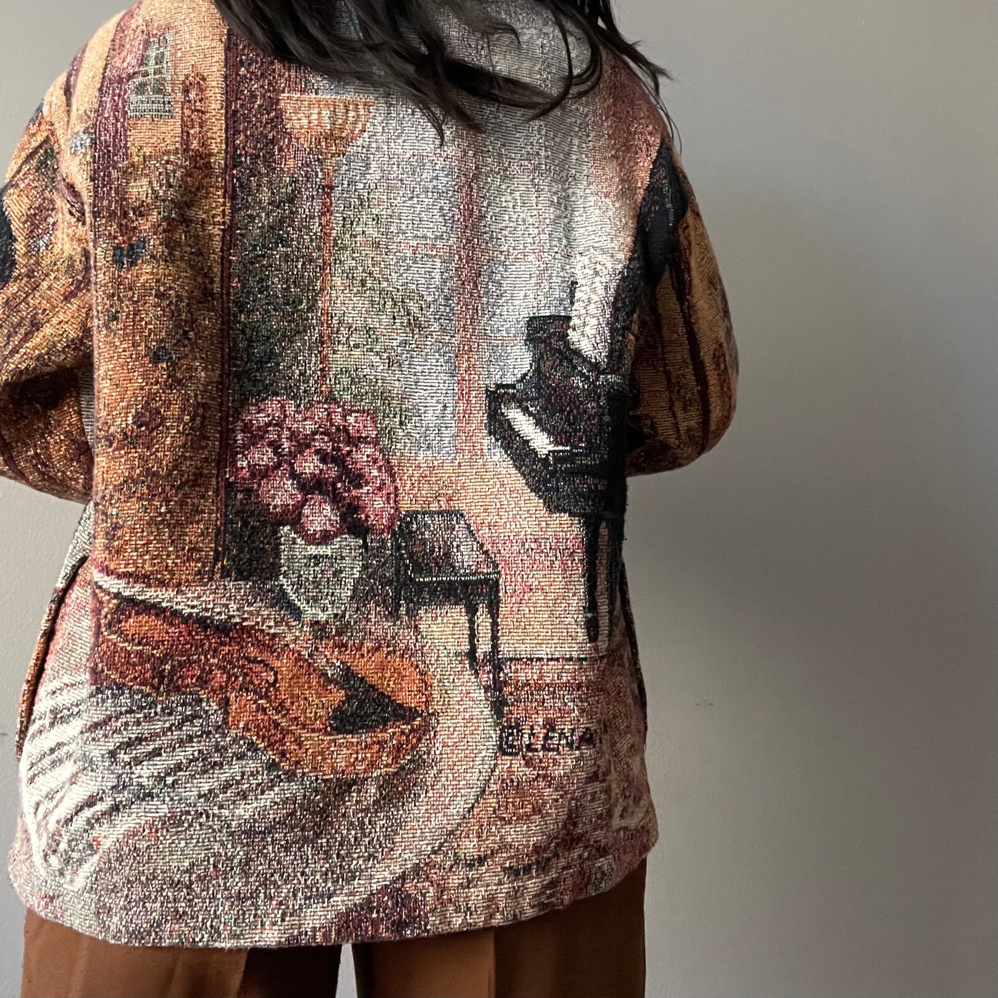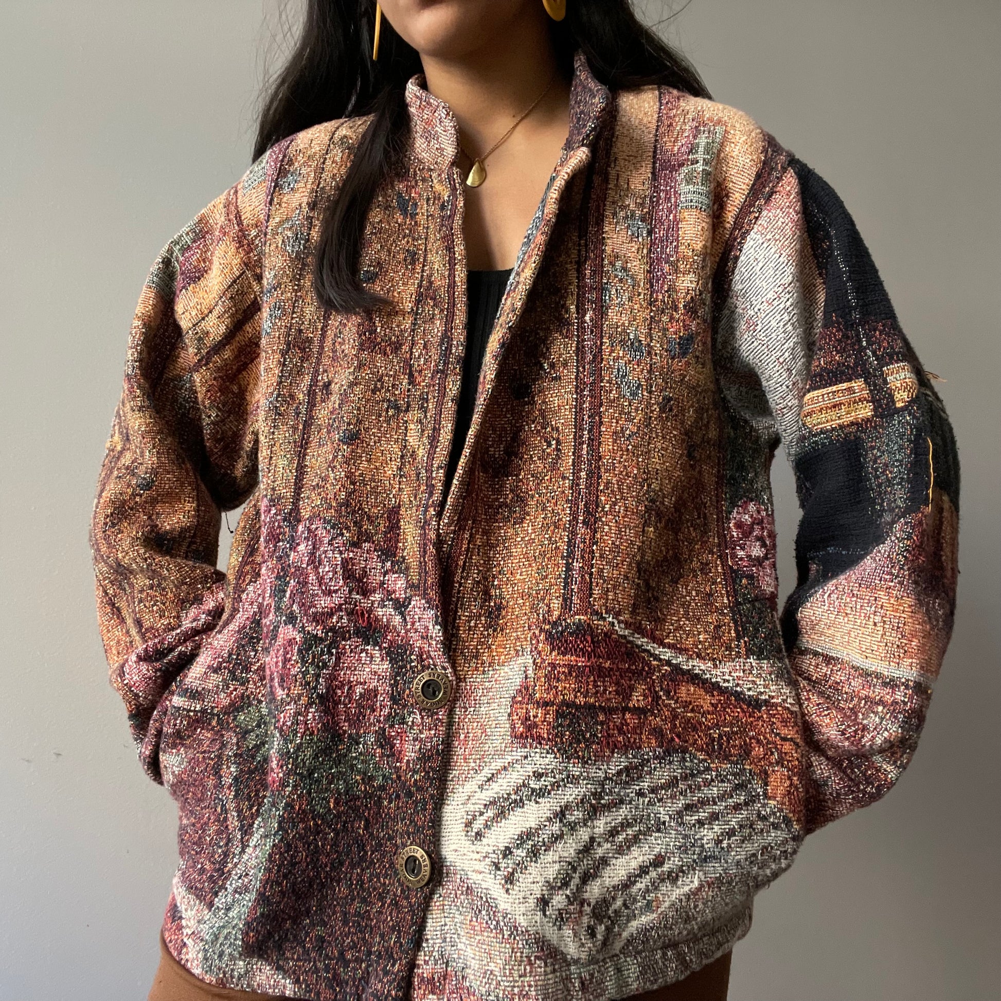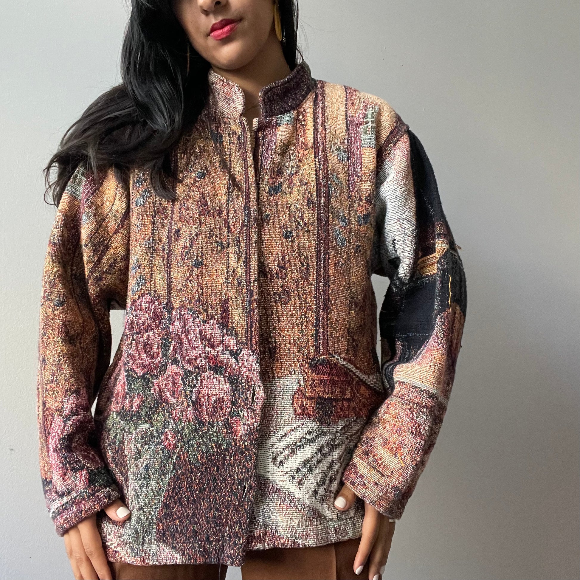 ITEM DESCRIPTION: Striking multicolored scenic still-life tapestry jacket