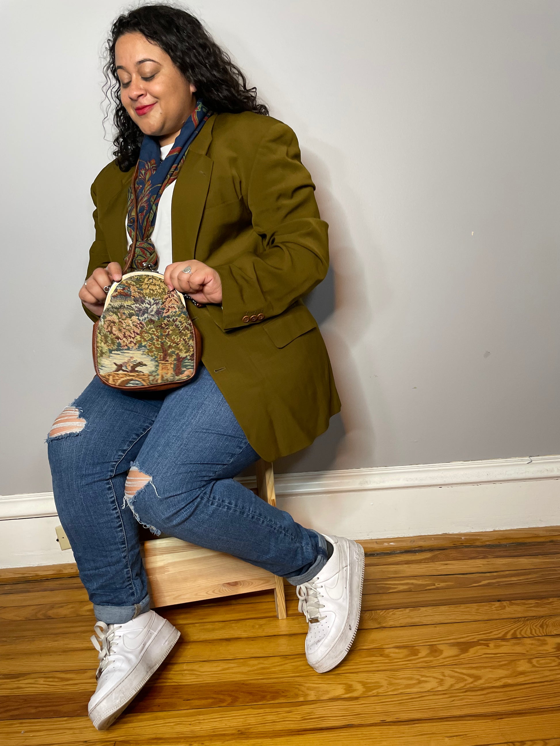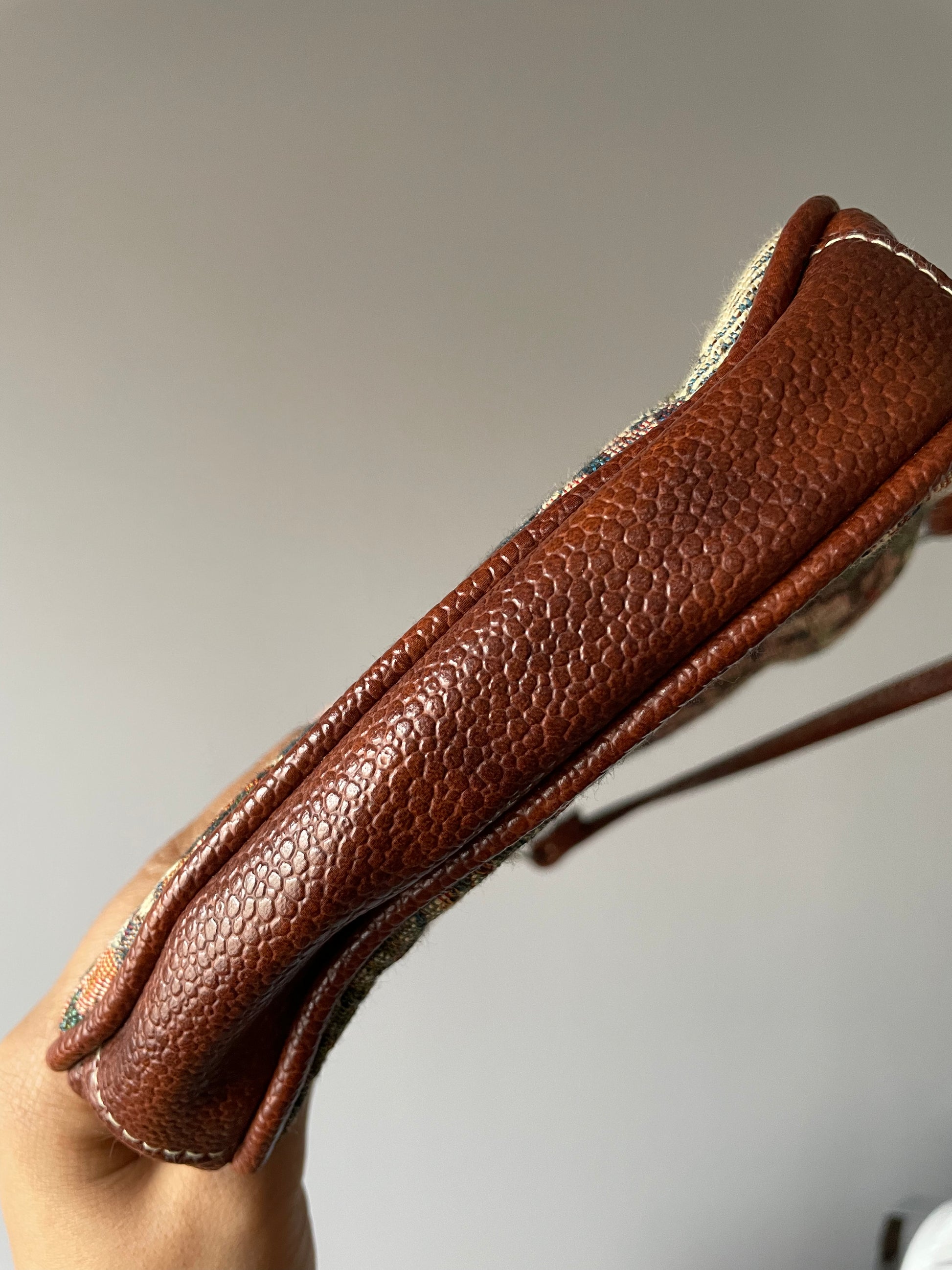 An adorable vintage tapestry bag that features a scenic pattern with, of course, a horse and its rider. The inside is faux leather, and the purse has a snap closure.