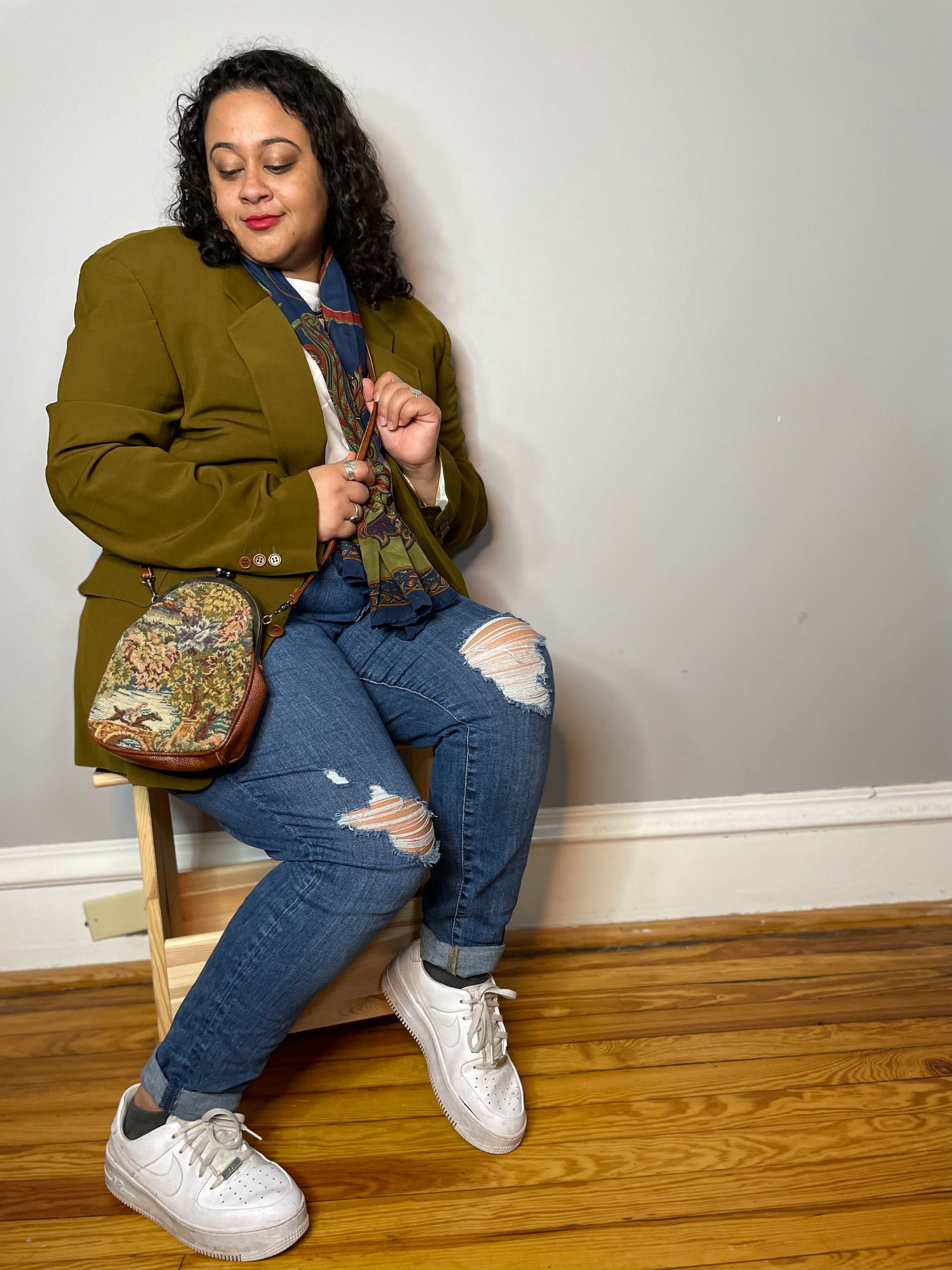 ADDITIONAL INFO: Some small scratches on the metal frame, and a small stain on the bottom of the purse (not visible when worn) - see photos.